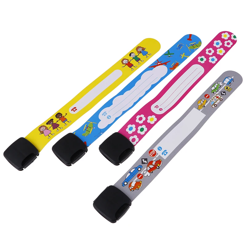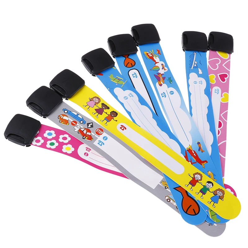 Informações de contato importantes podem ser escritas na pulseira para garantir a segurança das crianças.